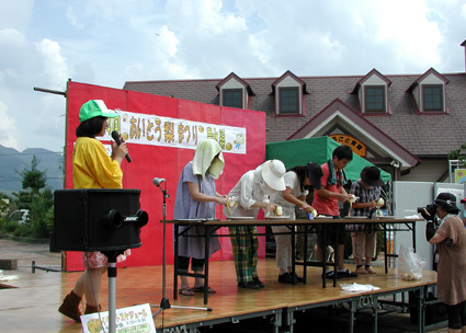このほかステージで催された皮むき競争、早食い競争、目方当てクイズ、ビンゴゲームなどを楽しみ、湖南市から訪れた家族連れは「楽しみながら、こんなに甘いナシがもらえるなんて」と、各競争に果敢に挑戦していた。