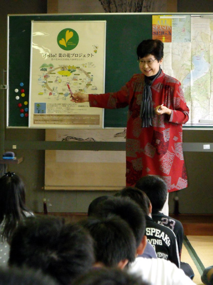 「(菜の花のバイオ燃料は)空気も大気も汚さず、人間の体にもいいエネルギー。遠くから化石燃料など資源を持って来るのではなく、自分たちの身の周りでエネルギーを作ることが大切」と説き、「今がチャンス。毎日の暮らしの中で、ちょっと工夫するだけでみんな生き延びることができる。今日から少しの工夫を始めましょう」と呼び掛けた。
