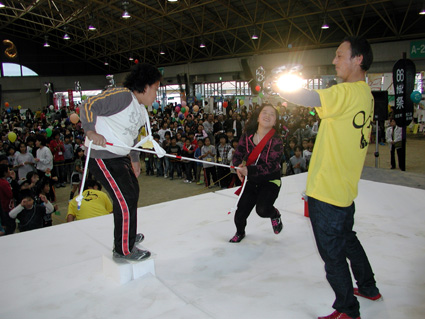 ひも相撲選手権大会の決勝では、子供(小学低学年・中学年・高学年)二十一試合と大人(中学生以上)八試合が行われ、ステージ下の応援席には多くのサポーターが詰め掛け、勝敗の行方を見守り声援を送っていた。