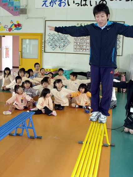 竜王町教育委員会(岡谷ふさ子教育長)主催の「スポーツ選手活用体力向上事業体操教室IN竜王幼稚園」が二日、竜王町立竜王幼稚園(村井ひとみ園長)遊戯室で催され、アトランタオリンピックの体操競技で日本代表だった内山隆さん(36)が体を動かして遊ぶ楽しさを園児に伝えた。