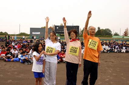 選手宣誓では、近江八幡市小船木町の中島博司さん(61)、豊子さん(61)、伊藤千尋さん(35)、萌さん(8)の三世代家族が健闘を誓うと共に、「おじいちゃんには絶対勝ちます」「孫にはまだまだ負けへんで-」などとほほえましく宣言し、緊張する選手たちを和ませた。