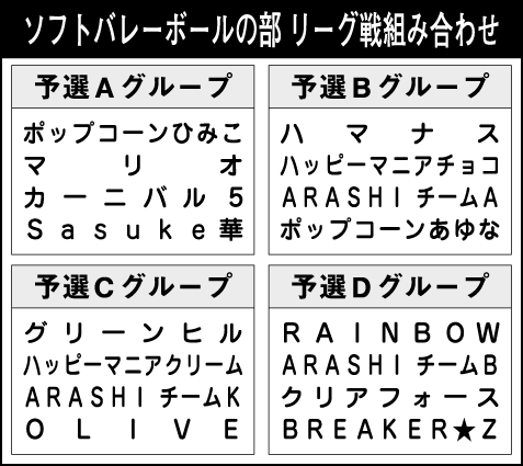 開会式に続くストレッチ体操で試合開始への準備を整えた後、メインアリーナ二コートを使ったトーナメント戦のバレーボールの部、二階サブアリーナ二面とメインアリーナ二面の計四コートでリーグ戦を繰り広げるソフトバレーボールの部に分かれて戦う。