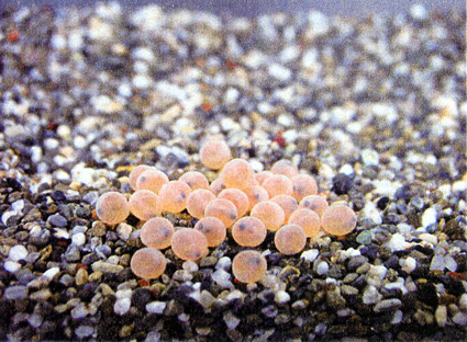 ビワマスは琵琶湖固有亜種で、十月下旬から十一月下旬にかけて産卵期を迎える。この時期、北湖の流入河川に遡上した親魚は、淵尻から平瀬早瀬の砂利底にすりばち型の産卵床を作り産卵する。産み付けられた卵は、砂の中で発生を続け、まもなく発眼期を迎えるま。そして、早いものは年末頃に艀化(ふか)。艀化した仔魚は一、二か月ほど砂の中で過ごし、一月下旬から三月上旬頃砂の中から泳ぎ出します。展示されている卵は、十月二十九日に採卵されたもので、現在発眼期を迎えている。同博物館では「この正月頃には艀化し、おなかに大きな卵黄を持ったかわいい仔魚が生まれてくる」という。