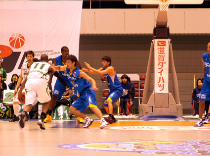 一戦目の二十九日は、長浜出身の小川伸也選手を中心に激しいディフェンスで相手のインサイド攻撃を封じ、ターンオーバー(オフェンスのミスでボールの保持がディフェンスに変わること)からの速攻やオールスターゲームのスリーポイントコンテストで連覇を果たした大津出身の岡田優選手の連続スリーポイントなどで波に乗り、点差を広げ、八十六対七十二で勝利した。