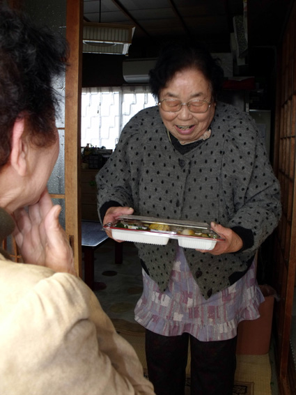 いつも楽しみにしているという山添八重子さん(85)は、山岡さんからお弁当を受け取り「新鮮な地元野菜を使ったおかずを何品も入れ、健康のことも考えてくれているのがうれしくてありがたい。一人でも心強いのは、みなさんのおかげ。一品一品かみしめていただく」と、多くの人の温もりに感謝していた。