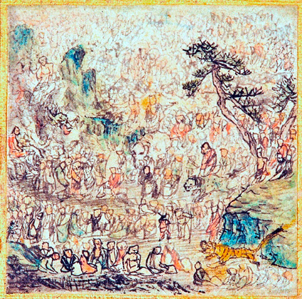 「方寸五百羅漢図」は一寸四方(縦横三・一センチ)の紙の中心に白像が描かれ、それを囲むように多くの羅漢と唐獅子、虎、龍が描かれている。羅漢の姿はそれぞれ異なり、所々に迷彩が施され、画面の小ささを感じさせない躍動感ある表現。