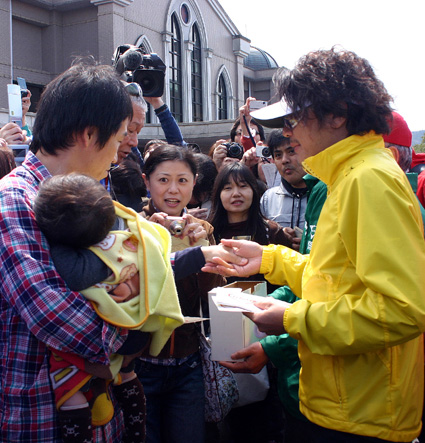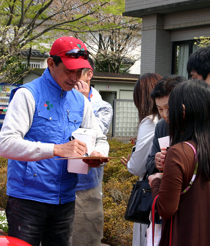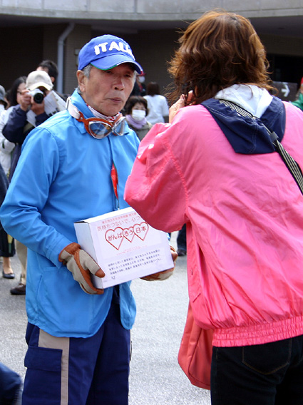 ドライバーとして参加したタレントの堺正章さん、近藤真彦さん、元F1レーサーの鈴木亜久里さんは到着後車を降りて、募金箱を持って義援金を募り、握手やサイン、記念写真などに応じていた。