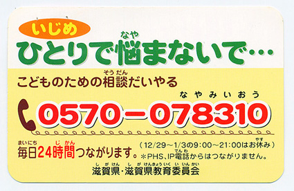 「こころんだいやる」の電話番号は077―524―2030で、開設時間は午前九時から午後九時まで(十二月二十九日~来年一月三日を除く)、「いじめの相談だいやる」の電話番号は0570―078310で、 開設時間は二十四時間対応(今年十二月二十九日~来年一月三日の午前九時~午後九時は除く)。