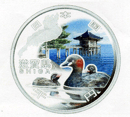滋賀県分の図柄(表面)は、千円銀貨幣が琵琶湖とカイツブリと浮御堂、五百円バイカラー・クラッド貨幣がビワコオオナマズとニゴロブナとなっている。