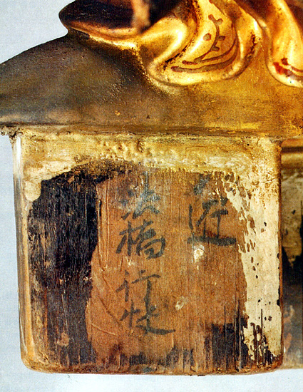 この調査は、これまで未調査だった同寺安置の木造阿弥陀三尊像(中尊が阿弥陀如来立像、左脇待が観音菩薩立像、右脇待が勢至菩薩立像)が快慶派の作風に似ていたため、大津市歴史博物館が六月上旬に行ったもの。観音菩薩立像を台座から外したところ、足ほぞ(台座に挿す部分)に「巧匠 法橋行快(こうしょう ほっきょう ぎょうかい)」の墨書銘が記されていた。