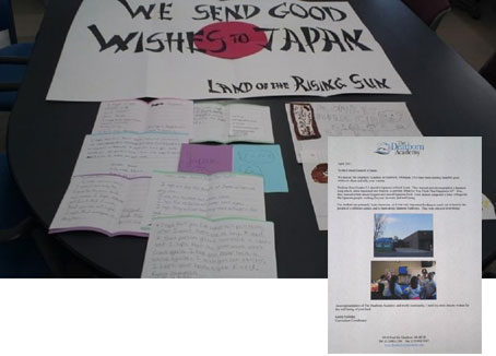寄せられたメッセージは「私たちの学校は何か目本の役に立ちたいと思って、日本復興のために、学校で焼き菓子の販売をして三万二千二百四十七ドル集めました。私たちは皆さんが元気でいることを祈っています」(マーブル小学校)、「私は日本の人々が全て元通りにできると思います。津波が二度と来ないことを祈っています」(ディアボーンアカデミー校三年生アリヤ・アブドゥルサラム)、「皆さんがご無事でおられることを祈っています。(同校三年生カザー・ノートン)など、心温まるものばかりだった。