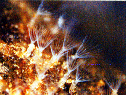 コケムシとは、水中の岩などの上に小さな個虫が集まった群体をつくる動物で、海や湖などに生息している。苔のような外見から、コケムシという名前で呼ばれている。コケムシの個虫は触手に生えた繊毛で水流を起こし、水中の微生物や有機物片を集めて食べる。