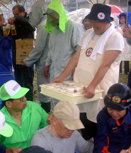 一方、六時二十五分には桐原区域住民に対し避難勧告が発令され、住民約二百七十人が次々と避難所に到着するとともに、民生委員らによる高齢者や障がい者らの安否確認、負傷者に対するトリアージや応急救護、ボランティア対応、緊急物資輸送、赤十字奉仕団による炊き出しなどの訓練が続けられた。