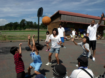 ブースター(ファンの呼称)ら約百人が見守る中、選手自身が選抜・編成した子どもたちとの混合チームで、スリーオンスリーの対抗戦を実施。「必ず勝つ」と勝利宣言したゴメス選手は、体を折り曲げて小さな子どもにパスを出し、岡田選手に抱えられてダンクシュートを決める女児も。得点が入ると、選手と子どもたちは、試合さながらにハイタッチをして喜びを分かち合った。
