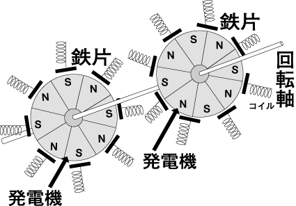 小型の発電機として一般に知られているのが、自転車の照明用発電機。図の発電機のように、N極とS極が交互に配された永久磁石を回転することで、鉄片が磁化され、コイルに起電力が生れる仕組みになっている。しかし永久磁石の磁力を強力にすると、磁石が鉄片を吸着しようとする大きな引力が働くことになる。この引力が回転軸に及ぼす力を“コギングトルク”(一種の抵抗力)という。