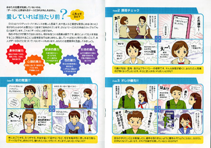 冊子は「あなたの恋愛充実度は何パーセント?~デートDVの話~」で、A5で八ページとなっており、発行数は一万部。特徴は(1)デートDVの事例を漫画で示し、デートDVについてわかりやすく説明(2)自分の気持ちや感情を相手の気持ちを考えながら誠実に伝えるアサーション・トレーニングにより、自己表現力を身に付ける。(3)デートDVや恋人のことで悩んでいる人のための専門相談窓口を案内―など。配布先は、県内大学、高等学校、中学校、各市町男女共同参画担当課、県内JR主要各駅(十九駅)などとなっている。