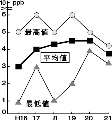 また、年間平均値は平成十六年度から上昇し、三ppbだったのが、同二十年度には四・五ppbまでに上昇。同二十一年度には三・六ppbに下がったものの、基準値の十分の一未満しか検出されない他の井戸と比べて突出していた。