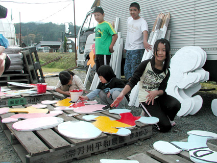 きっかけは、主催者の一人、農業の門田充史さん(36)=湖南市=が東日本大震災の支援ボランティアで知り合った福島県内のアーティストの女性二人を県内に招待したとき、二人が飛び出し坊やに感激して記念撮影を始めた。