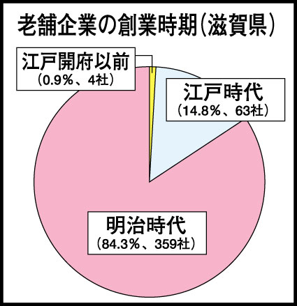 民間情報調査会社・帝国データバンクの調べによると滋賀県内の老舗企業の創業時期は、明治時代(一八六八~一九一二年)が三五九社あった。江戸時代(一六〇三~一八六七年)及び江戸開府以前(一六〇二年以前)は六七社を数え、その構成比は全国平均(一一・二%)を上回った。