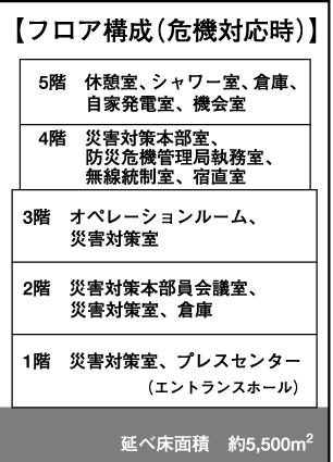 一階は災害対策室やプレスセンター、二階は災害対策会議室、災害対策室、三階は二百人を収容し災害時に現場に指令を与えるオペレーション室などとなっている。