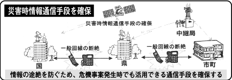また災害時の情報通信手段としては、県と市町の間では地上デジタル無線、県外向けには衛星回線を利用する。