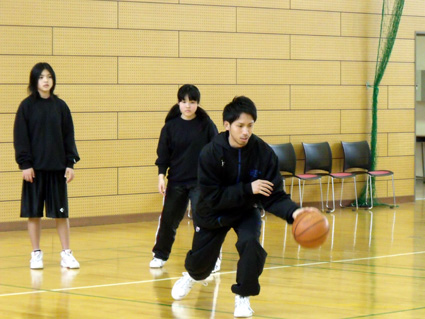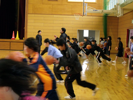 プロ選手と同じ練習メニューを織りまぜて進められるクリニック。参加した船岡中学校女子バスケ部十二人と聖徳中学校女子バスケ部二十二人、八日市ミニバスの小学六年生女子、高校でバスケ部入部を考えている船岡中男子二人は、準備運動の段階から集中力を切らさず取り組み、同時に理想の動きを体現する難しさを感じ取っていた。