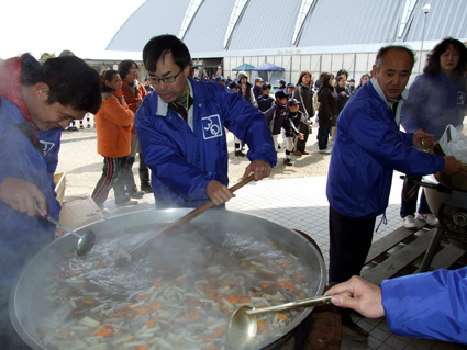 子どもたちの健やかな成長を願って地産地消による食の安全・安心を実践し、昼食には、能登川地区の魚のゆりかご水田で栽培された県環境こだわり米(コシヒカリ一〇〇%)で作ったおにぎり(約六百五十食)と、味噌を含めて地元産の食材をふんだんに盛り込んだ豚汁(約千食分)を振る舞った。