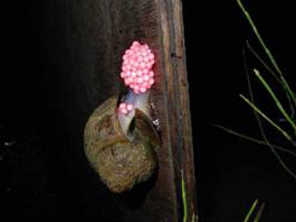 例えば日本在来のタニシ類は親貝の体から直接子どもの貝が生まれるが、ジャンボタニシは、陸上にピンク色の卵を産みつける。
