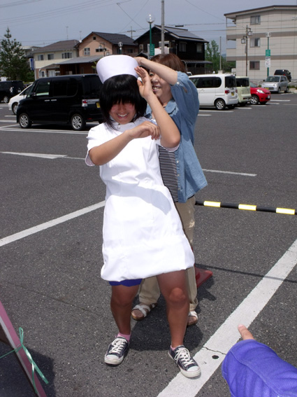 また、将来の職業選択の一つに加えてほしいとの願いを込めて、子どもたちを対象に白衣着用体験と記念撮影会を実施。ソフトボール部の練習帰りに仲間と立ち寄った奥田萌々さん=朝桜中三年=は「みんなに勧められて白衣を初めて着たけど、意外と着こなすのが難しかった。看護師さんはきれいなイメージがある」と語り、幼い子どもたちもナースキャップと白衣に身を包みポーズを決めていた。
