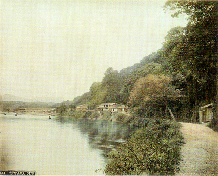 「手彩色古写真 大津石山」(明治時代)は、手彩色による古写真。現在の京阪電車石山寺駅付近から、石山寺方向に向って撮影されている。
