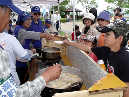 伊庭内湖の自然を守る会(長谷川美雄会長)が、下処理済みブルーギル二十キロ(約二百六十匹)とブラックバス五キロ(約十匹)のからあげや、会員が釣ってきたモロコ(約八百匹)の天ぷらを揚げたてで振る舞い始めると、すぐに長蛇の列ができた。