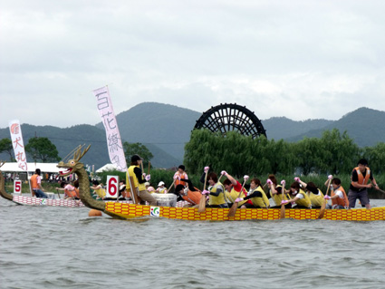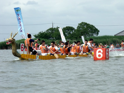 母なる琵琶湖に抱かれ、輝きを増す若い力―。能登川青年団主催の「第十九回ドラゴンカヌーヤングフェスティバル」が八日、能登川水車とカヌーランドで開かれた。能登川地区のシンボルである巨大水車近くの水郷地帯にも、太鼓の音色と漕手の掛け声が響き渡り、熱い夏の訪れを告げた。