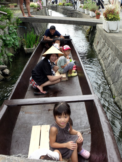 田舟の操縦は、船首につけた綱を引く人・船首に竿をさし舟が岸に当たらないよう間隔を保つ人・船尾にいて竿で舟をこぐ人の三人一組で行う。昔は“引き綱は嫁、船首に竿をさして舵をとるのは家の主、船尾で舟をこぐのは息子”という役割分担が普通だったとか。
