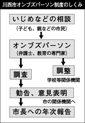 川西市のオンブズパーソン制度は、市内小中学生のアンケート調査で深刻ないじめの現状が浮き彫りになったのを受け、平成十年十二月、全国初の「子どもの人権オンブズパーソン条例」が議会の全会一致で可決され、翌年四月に設置されたもの。