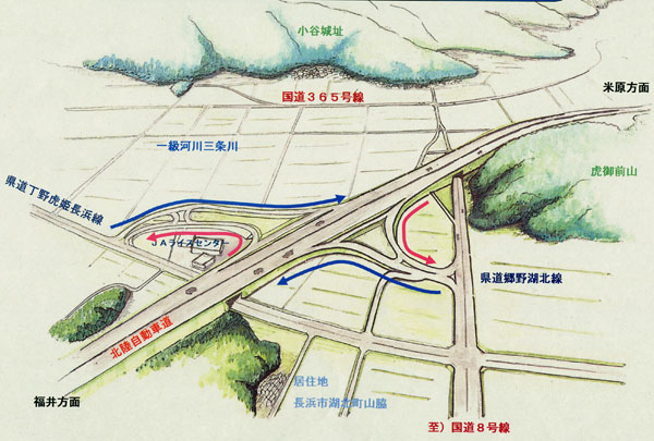 小谷城スマートICは、長浜市湖北町山脇地先において北陸自動車道と県道を経て国道8号、国道365号を接続するもので、今年の四月十七日に連結許可を得て、年度内に測量・設計、二十五年度から用地買収に入る。供用開始は二十九年三月末で、一日二千台が利用すると見込む。