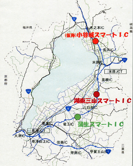 ETC搭載車両に限定し、簡易な料金所の設置で済むことから低コストで導入できる高速道路のスマートインターチェンジ(スマートIC)が、地域活性化の起爆剤として注目される中、県内でも平成二十五年度完成予定の蒲生スマートIC(東近江市)、湖東三山スマートIC(愛荘町)に続き、同二十八年度完成予定の(仮称)小谷城スマートIC事業(長浜市)が動き出した。
