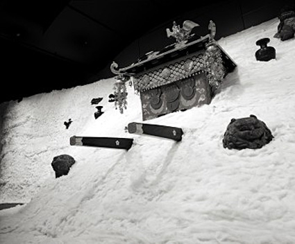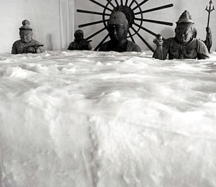 ホワイトアウトとは、視界全体が真っ白になり、感覚が失われる現象。小沢氏は三井寺の重要文化財である釈迦堂と一切経蔵の空間をホワイトアウト(雲海をイメージさせる白で覆いつくした空間を出現)することにより、伝統建築の持つ空間を異化し、あるいは更に際立たせる表現を試みる。