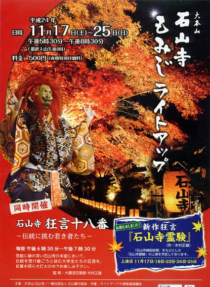 これにあわせて境内本堂では期間中の午後六時半から一時間にわたって、狂言を本格的に学ぶ京都の大学生が、狂言十八番(大蔵流狂言師、木村正雄氏監修)を奉納する。無料。ただし、入山料五百円は必要。