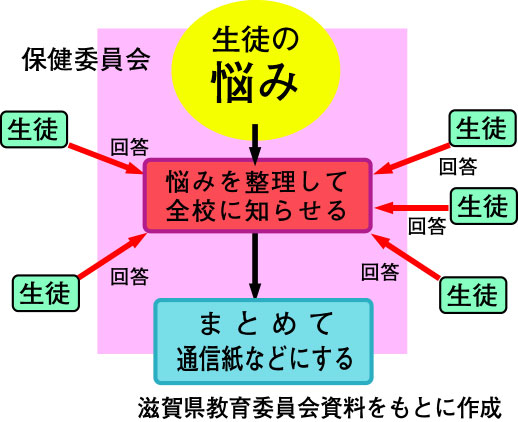 同中学校では、保健委員会(三十六人)が中心になって、下図の様に紙上悩み相談の様式でピア・カウンセリングを行っている。