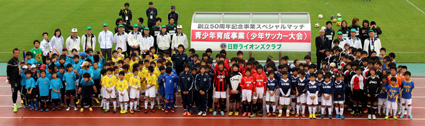 日野ライオンズクラブは十九日、東近江市の布引グリーンスタジアムで開催された日本フットボールリーグ(JFL)公式戦「MIOびわこ滋賀対ツエーゲン金沢」を、創立五十周年記念青少年事業スペシャルマッチとして開催した。