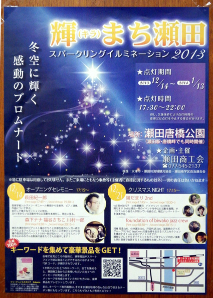 また、点灯セレモニーを十四日午後五時十五分から行い、あわせて同日と二十一日にジャズ生演奏、お楽しみ抽選会を開く。問い合わせは瀬田商工会(TEL077―545―2137)へ。