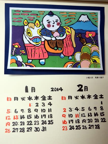 小幡人形は近江を代表する郷土玩具で、江戸時代中期から細居家が作り続けている。カレンダーの原画は、東近江市在住の作家・田中武さんが描いた。制作は知的障害のある版画班のメンバーが、木版を掘り上げ、一枚一枚丁寧に一年かけて刷り上げた。