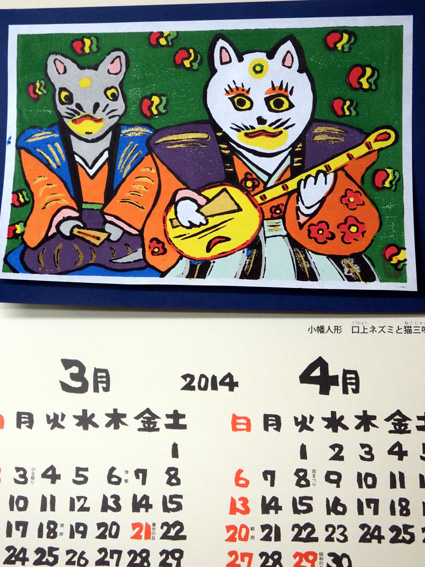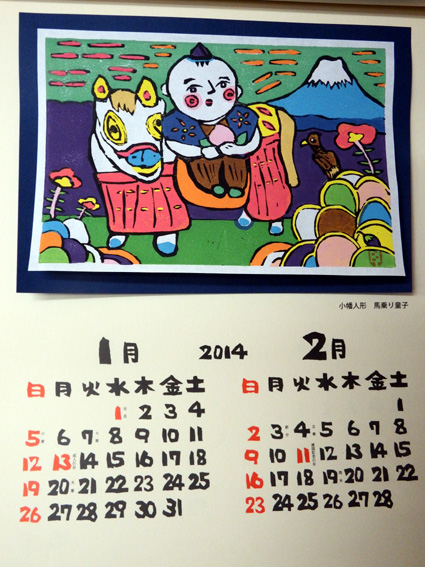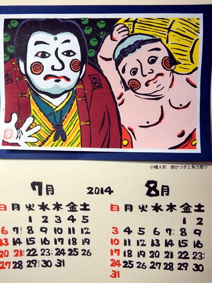 小幡人形は近江を代表する郷土玩具で、江戸時代中期から細居家が作り続けている。カレンダーの原画は、東近江市在住の作家・田中武さんが描いた。制作は知的障害のある版画班のメンバーが、木版を掘り上げ、一枚一枚丁寧に一年かけて刷り上げた。