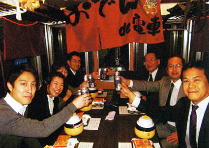 乗客は歓談や車窓の風景を楽しみながら、おでん盛り合わせ、おつまみ弁当、あられ、飲み物三本(缶ビール、カップ酒、缶チューハイ、ペットボトル茶、ジュース)に舌鼓を打つ。