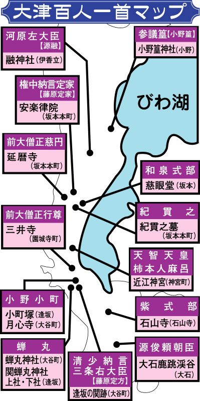 天智天皇を含めて、歌人ゆかりの地=マップ参照=は、小倉百人一首の撰者である藤原定家の安楽律院や紫式部の石山寺など十五人、十六か所に上る。「一つの市でこれだけ多いのは誇るべきこと」と、びわ湖大津観光協会の田中真一事務局長は話す。