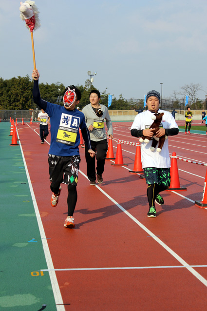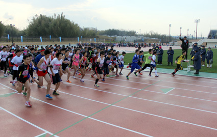 第52回東近江元旦健康マラソン大会が1日、布引グリーンスタジアム周辺で開催された。県内外から参加した1321人が初春の蒲生野をそれぞれの今年1年の抱負や目標を胸に、さわやかに駆け抜けた。「私たちはこの大会に参加できることを感謝します。東京オリンピックの開催が決まり、私たちも大きな夢と目標をもつことができました。今年1年間の健康と幸せを求めて、最後まで全力で駆け抜けることを誓います」と滋賀学園中学校3年生の飯田優月さんの力強い選手宣誓で大会が開幕。スタジアムを発着点とする3キロの「もみじコース」、5キロの「むらさきコース」、10キロの「あかねコース」の3コースで、年齢と性別などで分れた11部門と親子や仮装で楽しむ参加も多かったジョギングの部門で、それぞれの目標やスタイルで走り初めを行った。ゴールした参加者には温かいぜんざいが振る舞われた。大会開催には今回も、東近江市水道工事協同組合(光田博理事長)の会員35社による全コースのゴミ拾いや小石の除去などの清掃活動が昨年12月27日に行われており、選手の安全な走行を裏で支えた。