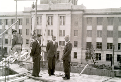 今回は、昭和二十八年の建設中の写真と同二十九年六月の開館当時の写真三十五枚を、現在の写真と比較して展示しているもの。土日を除く平日の午前八時半から午後五時十五分までの間、自由に見ることができる。