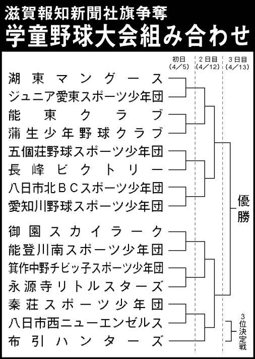 今回も東近江市内と愛荘町内の少年野球十五チームが出場し、五日、十二日、十三日の三日間にわたるトーナメント戦で滋賀報知新聞社旗をめざす。また、優勝チームは八月に東京神宮球場で開催される全国大会出場をかけて、五月の彦根市での県大会に湖東地区代表として出場する。