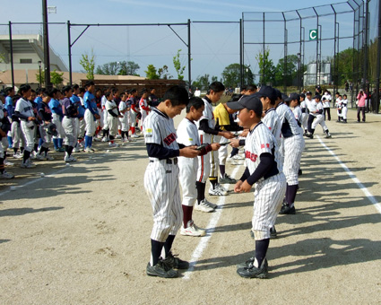 東近江市の学童軟式野球チーム「八日市西ニューエンゼルス」が今年、創立40年を迎えた。その記念大会として5日、6日に「八日市西ニューエンゼルス創立40周年記念交流大会」が布引グリーンスタジアム多目的グラウンドで行われた。