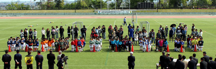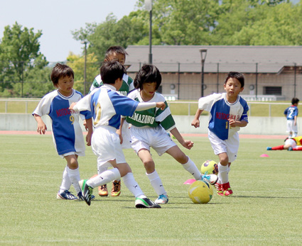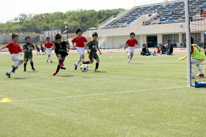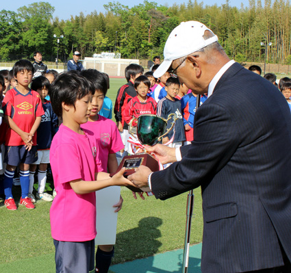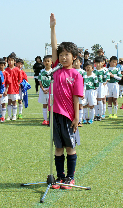 第3回湖東信用金庫理事長杯少年サッカー大会が10日、東近江市の布引グリーンスタジアムで開催された。地域に貢献する金融機関として、青少年健全育成、子育て支援、相互交流と友好を目的に毎年開催。まだまだ試合には出してもらえない小学3年生以下の選手たちに、県下1を誇る芝生グラウンドで試合を経験することで、サッカーの楽しさを体感し、正しいルールやマナーを学んでもらうため、6人制による12分ハーフのミニサッカー形式で行わた。店舗展開する東近江・近江八幡・甲賀の各市と日野町から参加の少年サッカーチーム12チームが、3チームずつ4グループでの予選リーグにより、1位・2位・3位ごとのトーナメントで順位を決定した。昨年優勝のFCジュニオールの梅辻奨主将が「こんなすばらしいコートでサッカーができることに感謝し、きょう一日、チームの仲間と精一杯、楽しく、サッカーすることを誓います」と選手宣誓。選手たちは勝っても負けても、うれしそうに伸び伸びと元気いっぱいのプレーを繰り広げた。